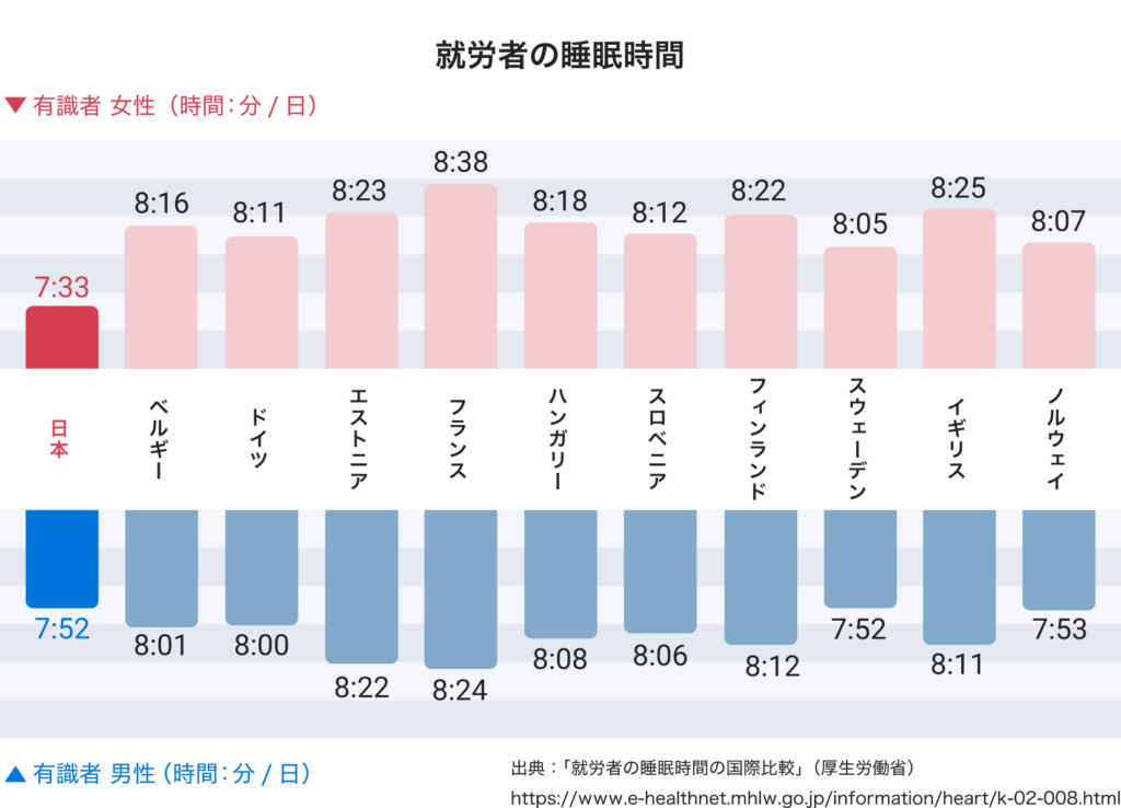 日本は多くの人が「何らかの睡眠の悩みがある」と回答しています。日本人、特に就労者の睡眠時間は世界で最も短いと言われており、就労者の男女別の睡眠時間を国際比較しても日本人の睡眠時間が如何に短いかがわかります。