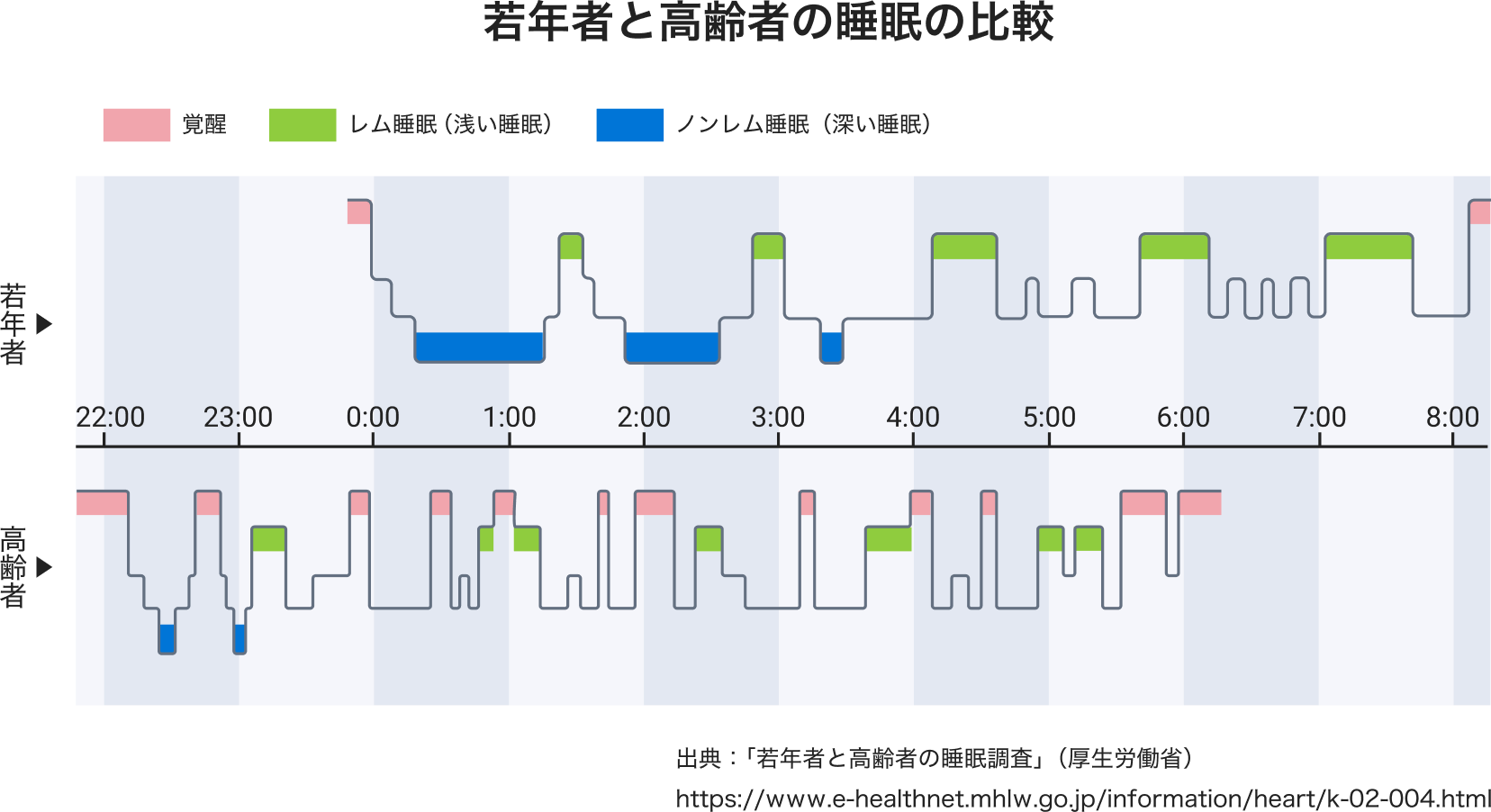 睡眠は年齢とともに変化していきます。健康な高齢者の方でも、 歳をとると睡眠が浅くなり、中途覚醒や早朝覚醒が増加します。睡眠脳波をみると、深いノンレム睡眠が減り、浅いレム睡眠が 増えるようになります。
