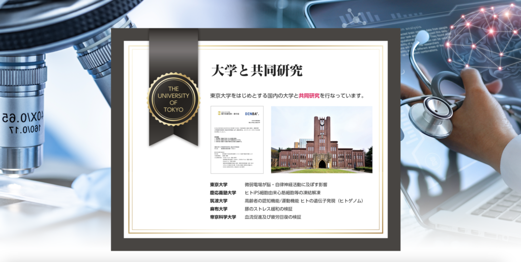 DENBAは東京大学と伊藤忠商事株式会社との共同研究により、 15分程度の電場印加が、 自律神経(交感神経・副交感神経の双方)の活動を 高めることを確認しています。