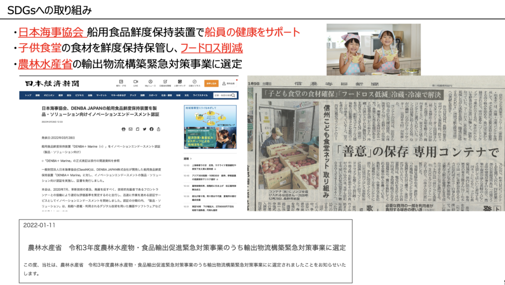 低周波を用いて空間中の水分子を振動させる独自技術(DENBA技術)を確立し、これを活用して食品分野における鮮度維持を実現。特に肉類、魚介類、青果物などの生鮮食品の品質保持に大きな成果を上げています。